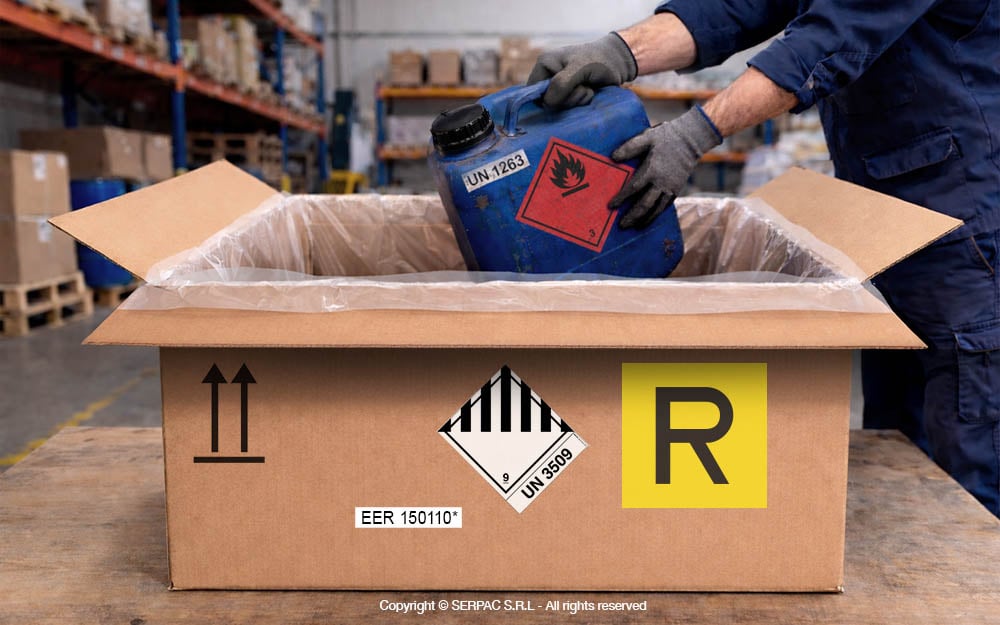 La classificazione UN 3509 si applica esclusivamente quando gli imballaggi sono destinati a smaltimento, riciclo o recupero del materiale. Se invece l’imballaggio viene spedito per essere riutilizzato, riparato, ricondizionato o sottoposto a manutenzione, non si applica UN 3509. In questi casi si utilizza normalmente lo stesso imballaggio ricevuto, con le etichette già presenti, senza applicare etichetta R o codice EER.